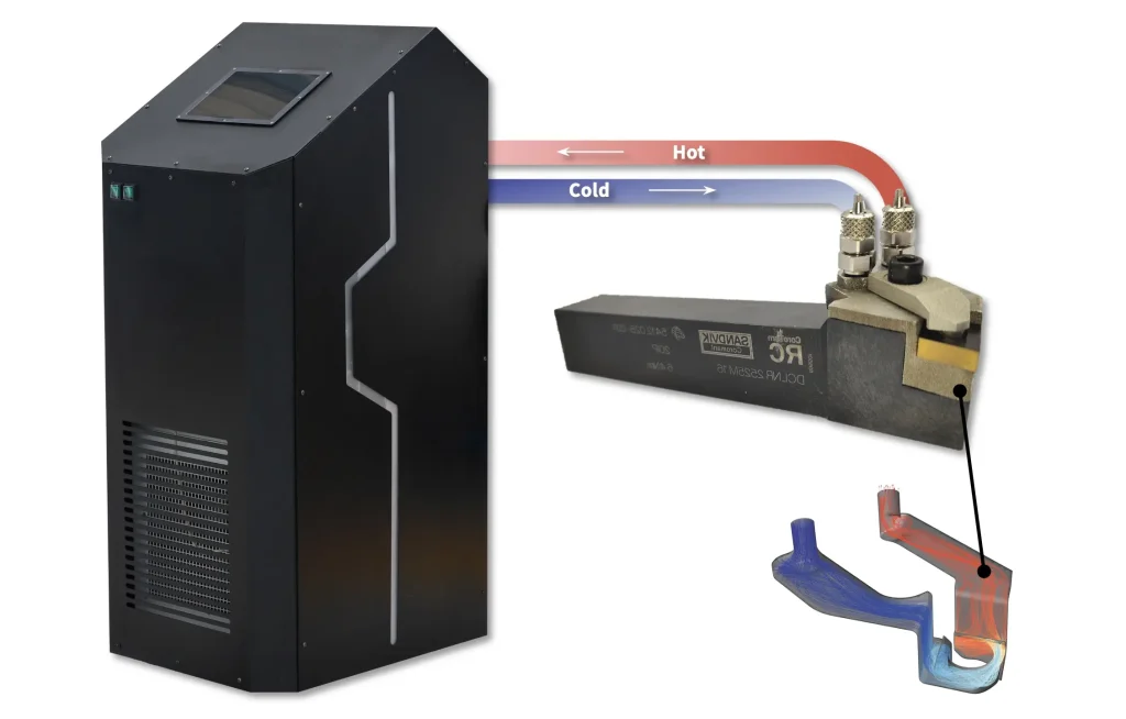 - The cooling element at the tool absorbs heat and returns the warmed fluid to the unit, where it is cooled again.